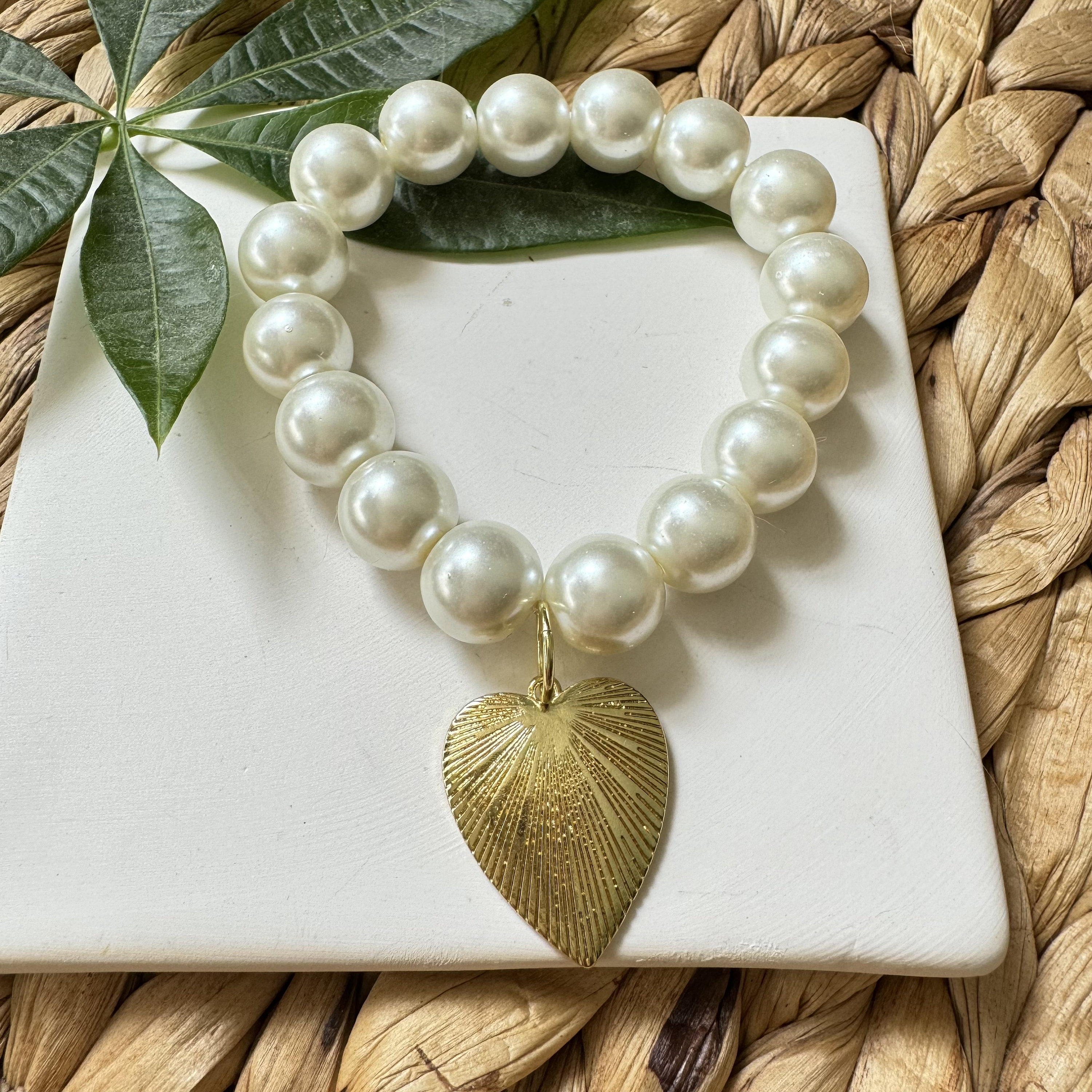 12mm glass pearl beads on stretch cord with a gold heart charm.