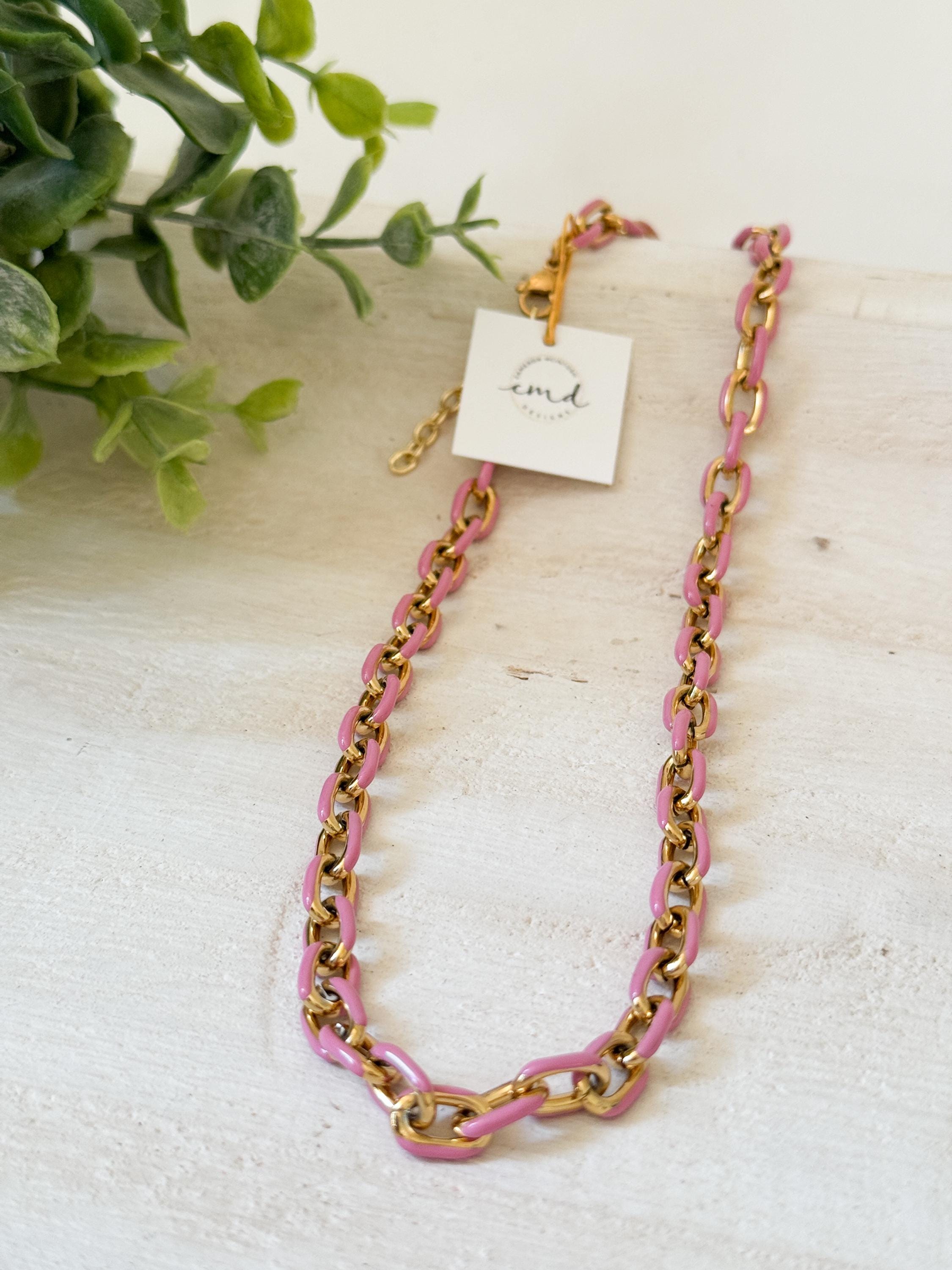 Approximately 16” long with a 2” extender. Pink enamel on gold stainless steel. Great for layering!