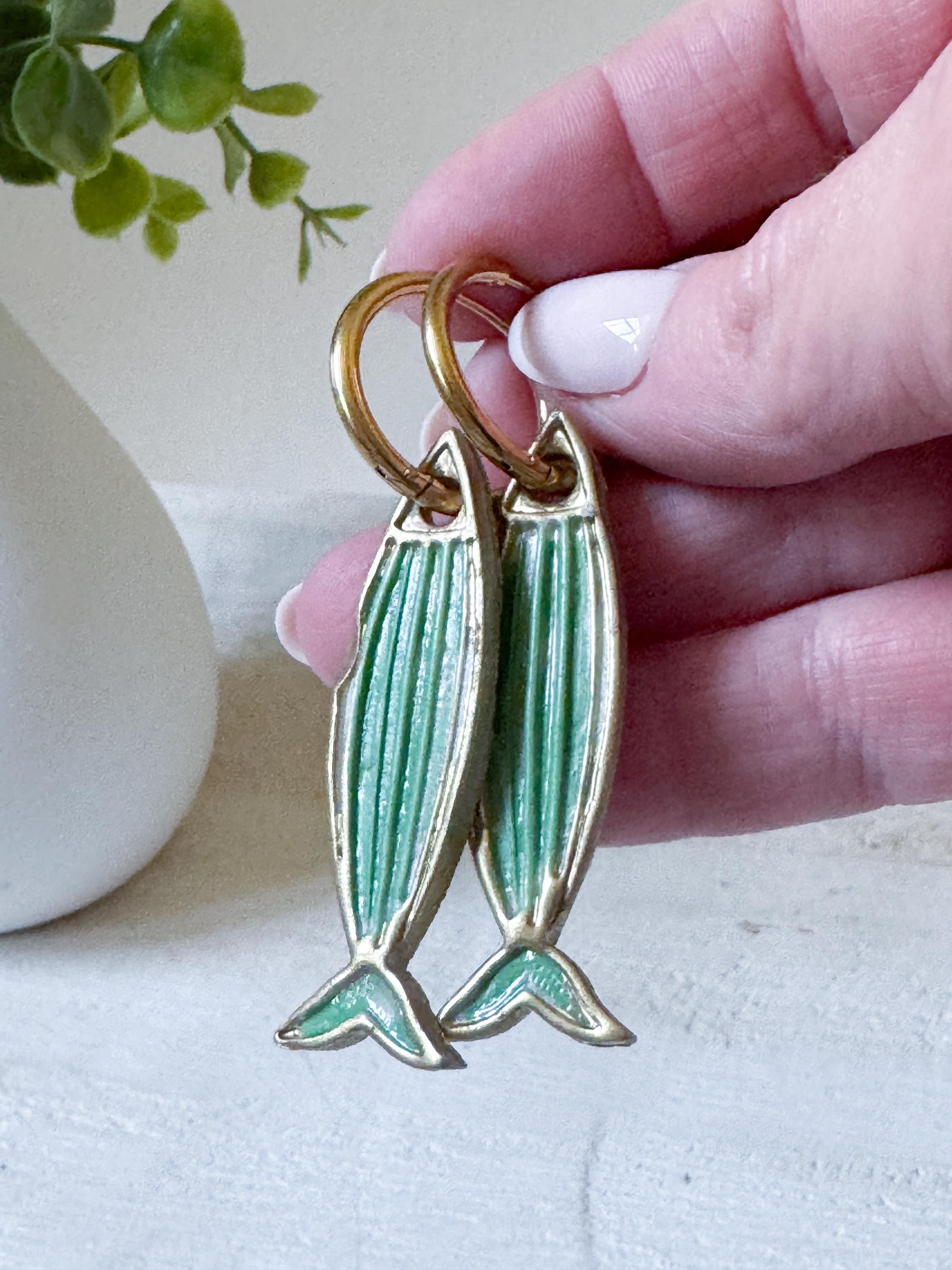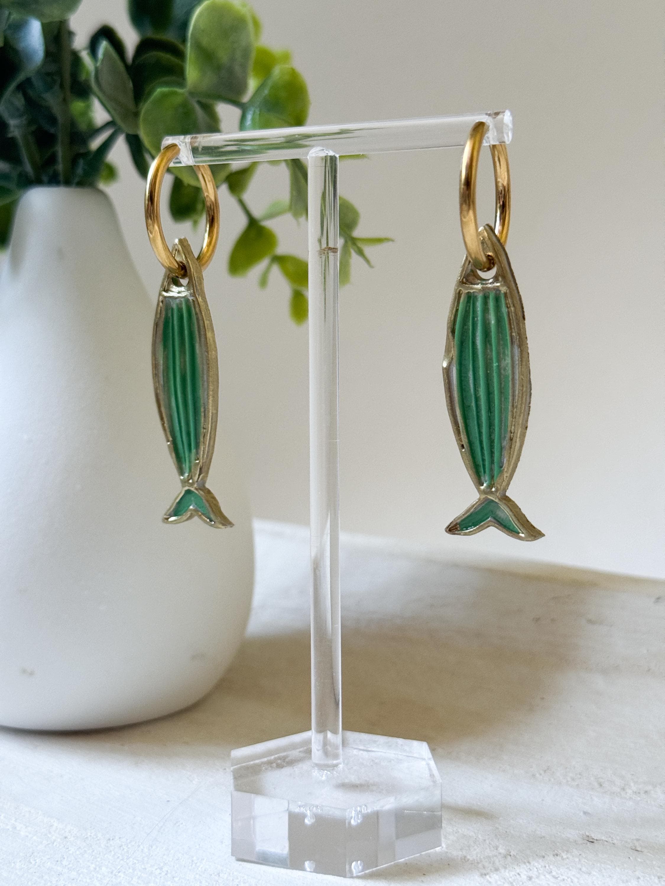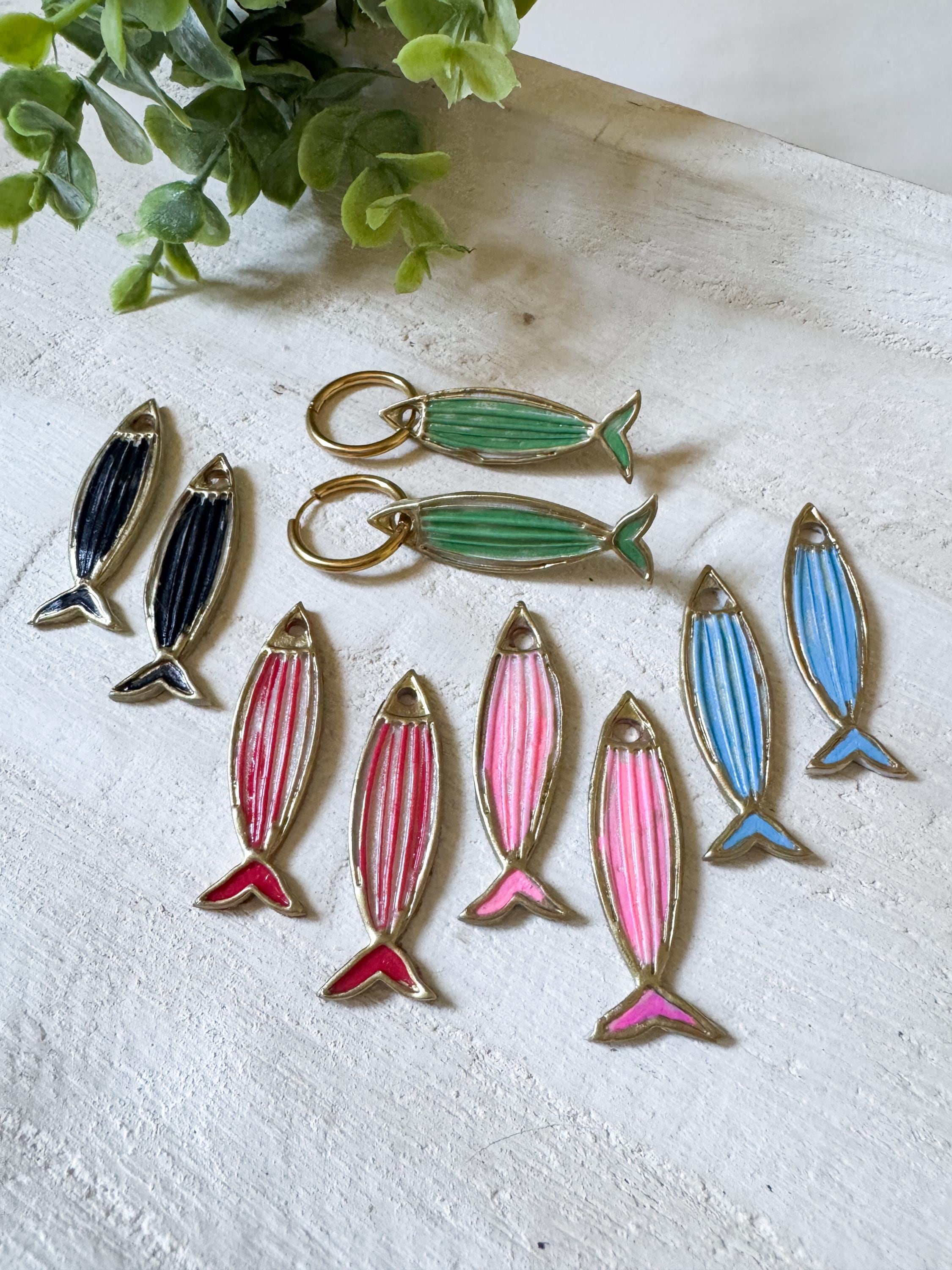 Handmade and hand painted interchangeable polymer clay fish on stainless steel gold hoops. A color for every outfit!