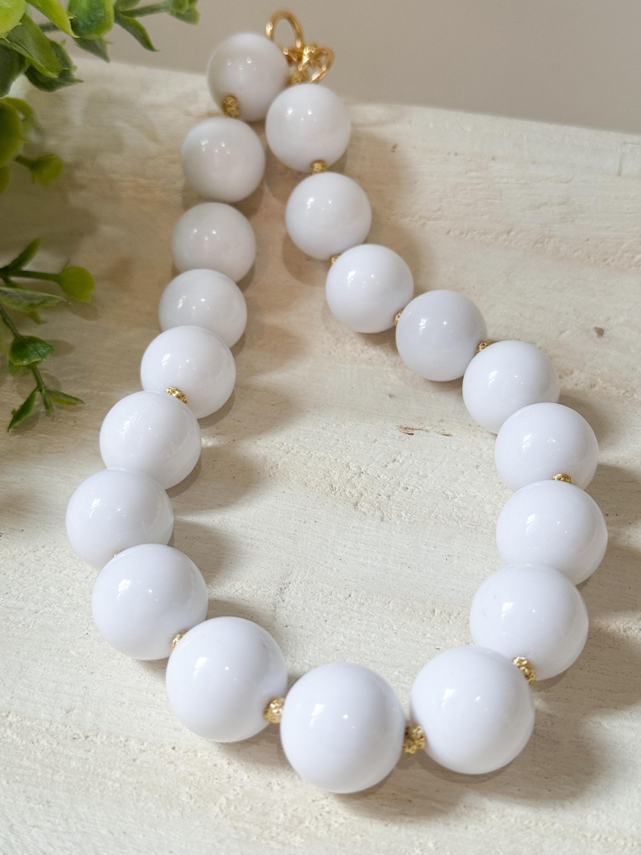 White acrylic beads separated by light, metallic gold cord knots.