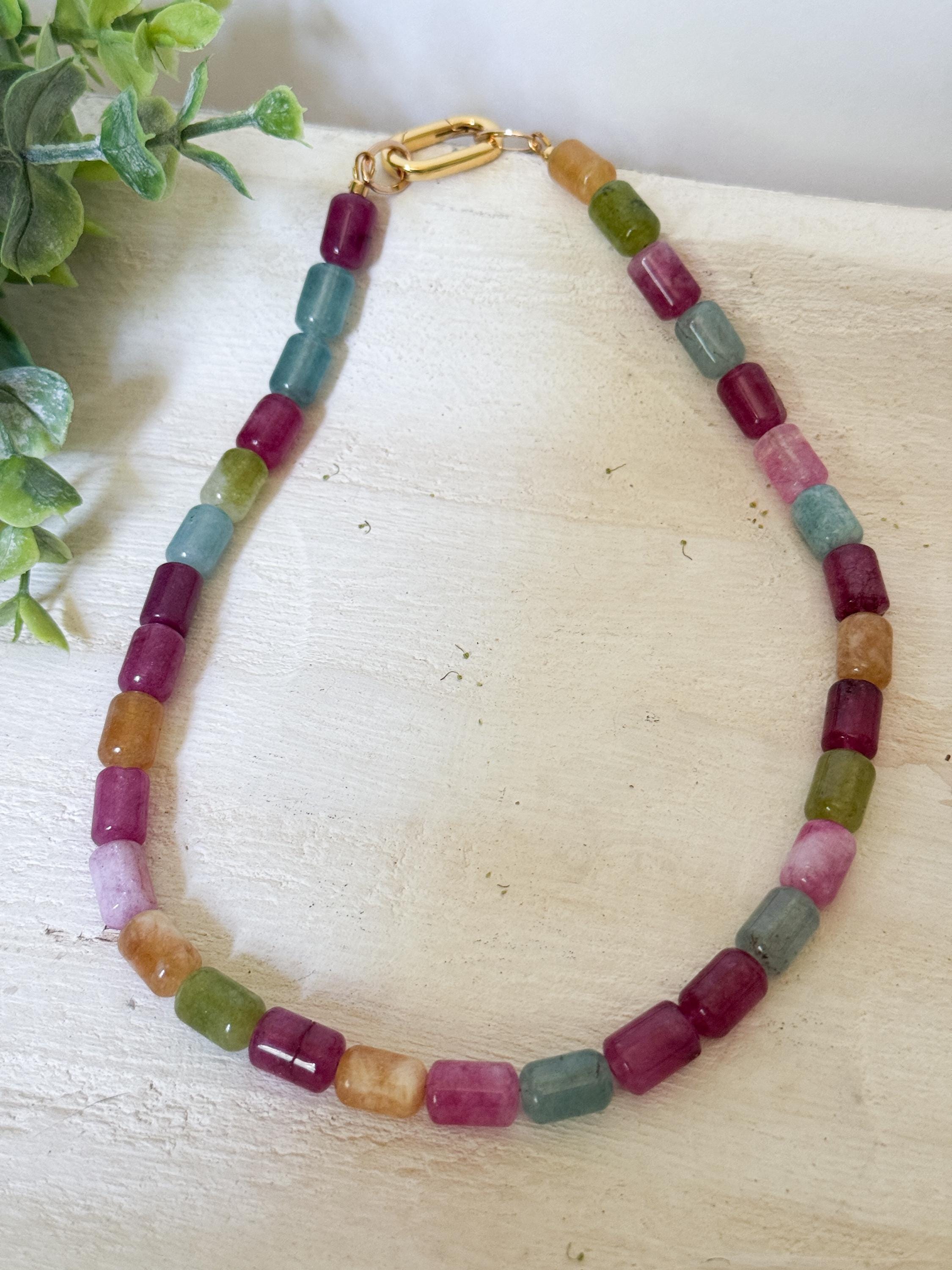 Gorgeous, colorful dyed jade tourmaline barrel beads with a carabiner spring clasp that can be worn in the front or back, with or without added charms.