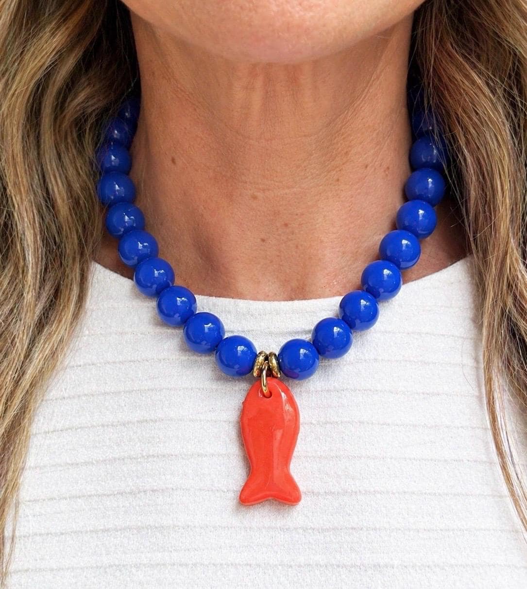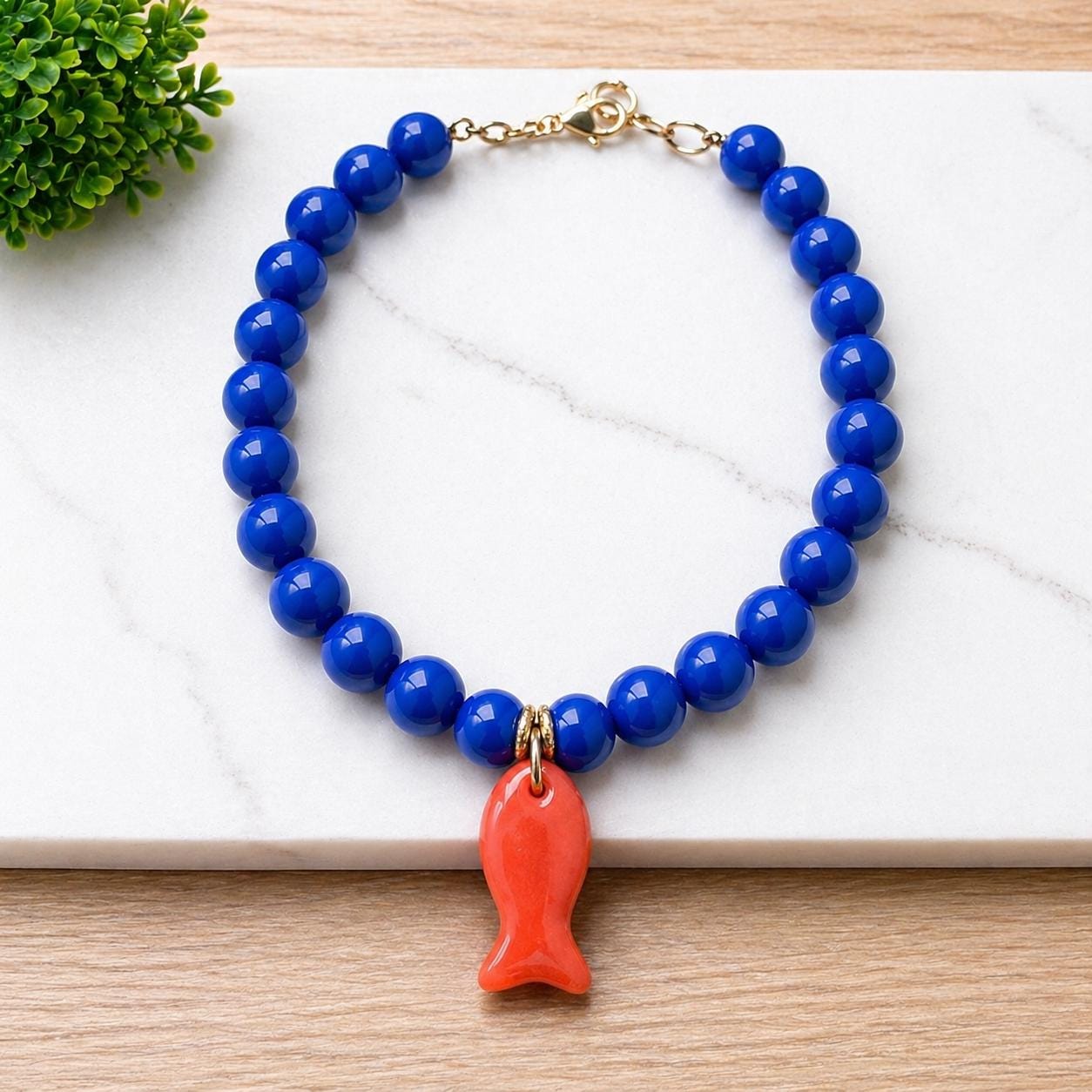 This fun necklaces consists of 16mm bright royal blue beads and a handmade, bright coral orange polymer clay fish pendant.