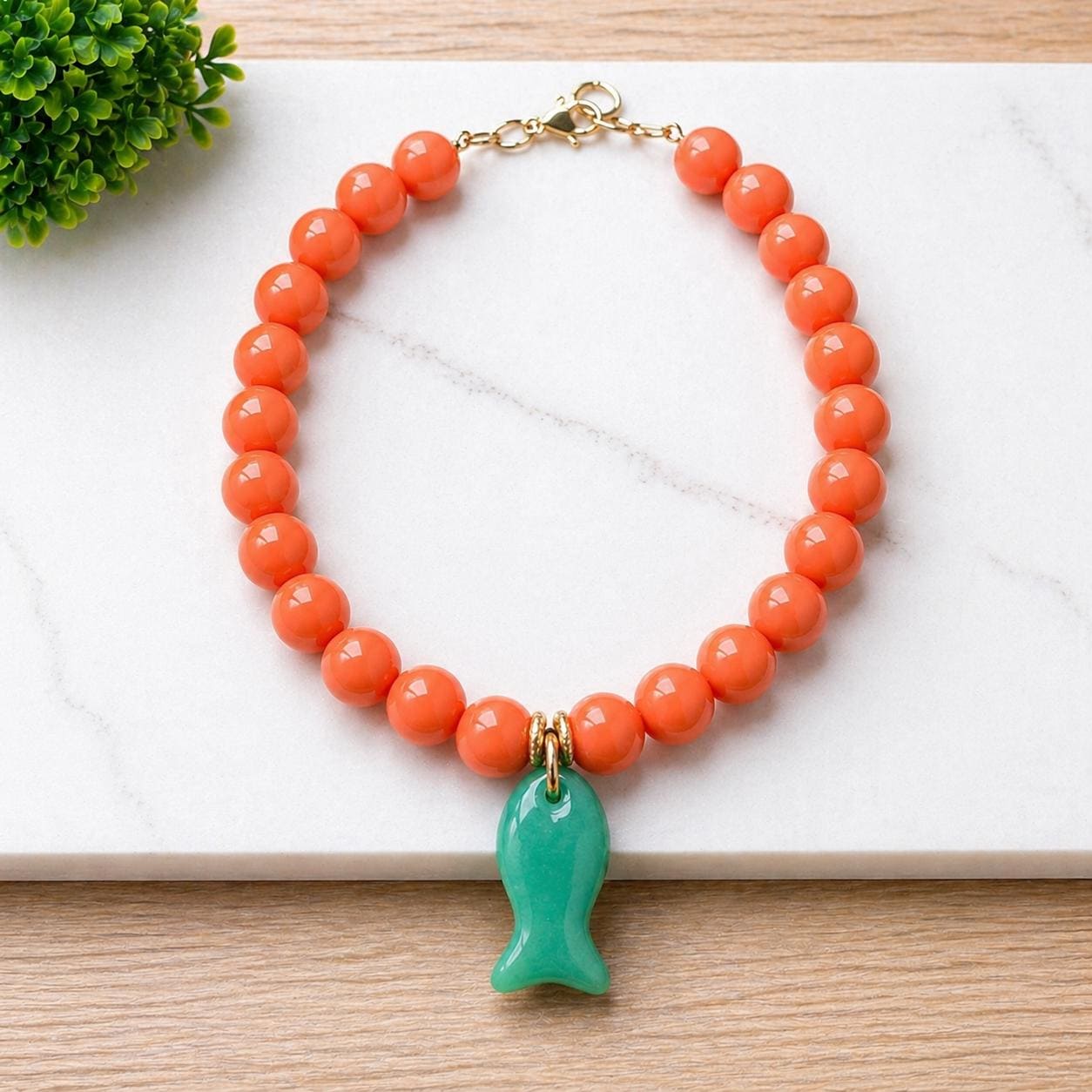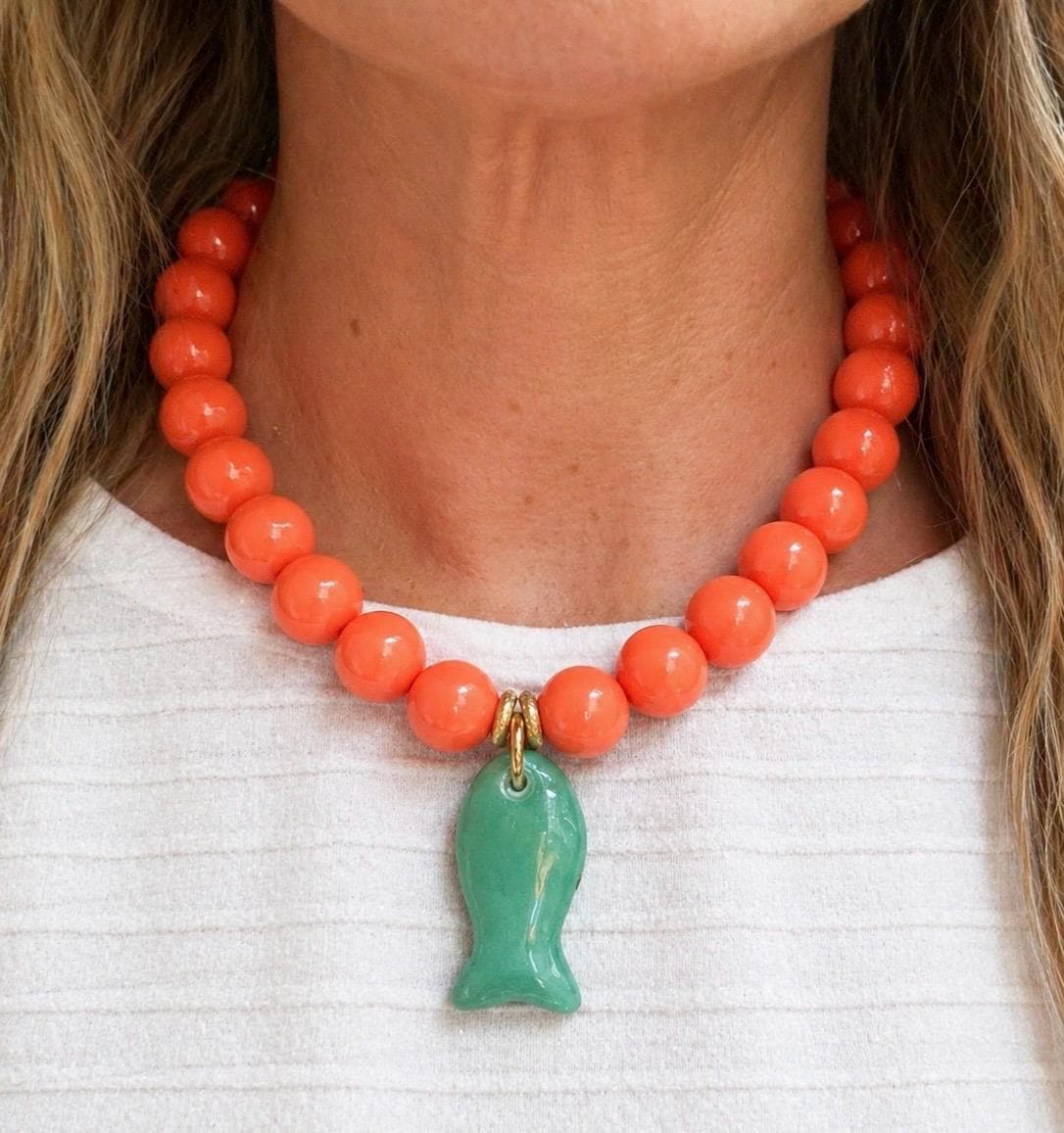 This fun necklaces consists of 16mm bright coral orange beads and a handmade, turquoise green polymer clay fish pendant.